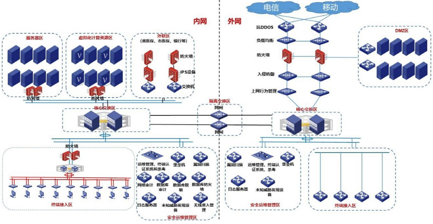 5) 安全设备部署情况:在内网的安全运维管理区部署终端认证系统和杀毒、堡垒机、漏洞扫描、网络审计、数据库审计、日志服务器、未知威胁发现设备、无线准入设备;在内网的外联区,通过部署防火墙及IPS设备,统一对省市医保、银行等外联业务进行防护;在外网的安全运维管理区部署漏洞扫描、运维管理及终端认证系统和杀毒、堡垒机、日志服务器、未知威胁发现设备;在外网的出口区部署抗DDOS、负载均衡、防火墙、入侵防御、上网行为管理设备。